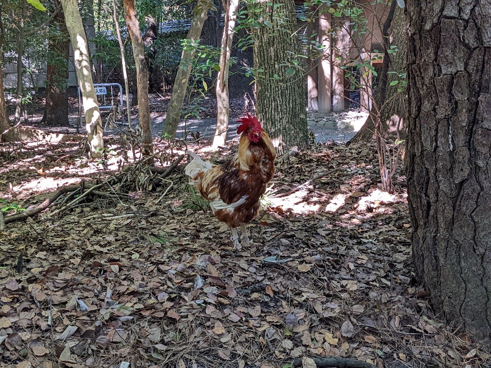 本宮に向かって歩いていると突如、「コケコッコー!」と、どこからともなく鶏の鳴き声が聞こえてきました。そう、鶏です。