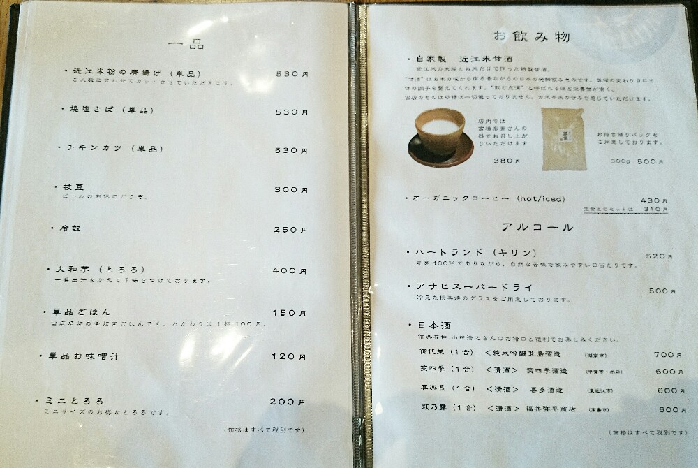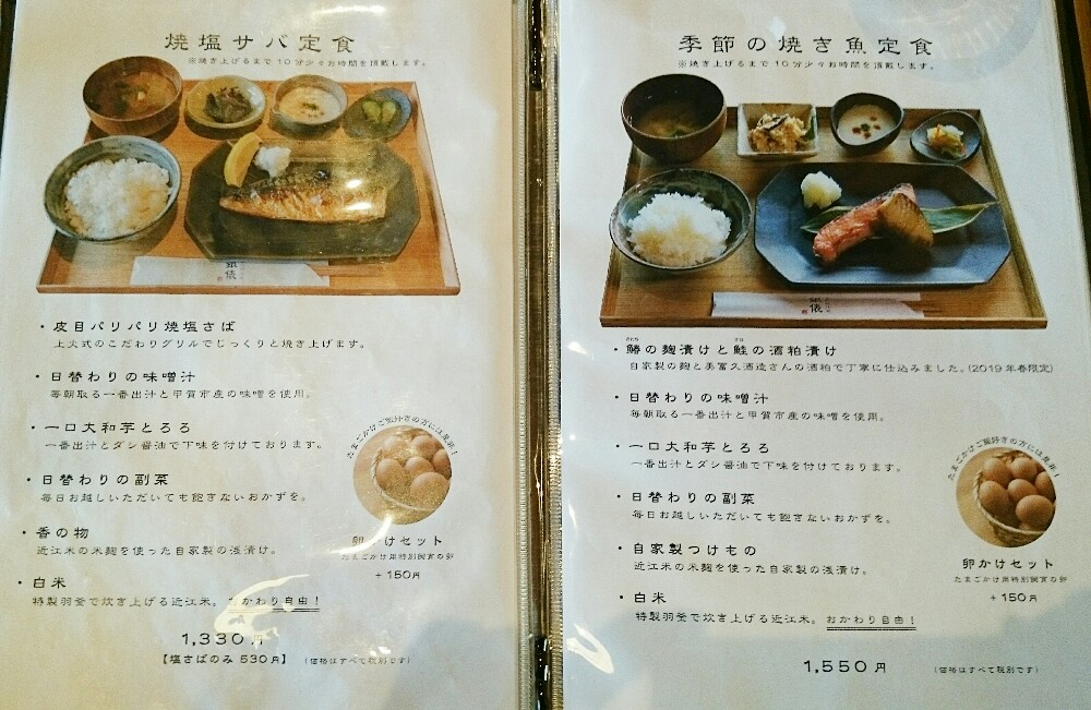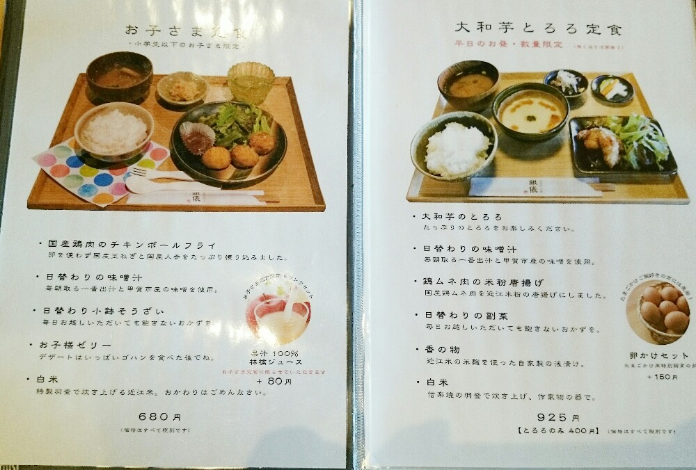 | ■近江米粉の唐揚げ定食 \1330 ■チキンカツ定食 \1330 ■焼塩サバ定食 \1330 ■季節の焼き魚定食 \1550 ■大和芋とろろ定食 \925 ■お子さま定食 \680(小学生以下のお子さま限定) |