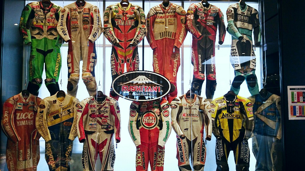 有名レーサーが着用したレーシングスーツの数々が飾られています!