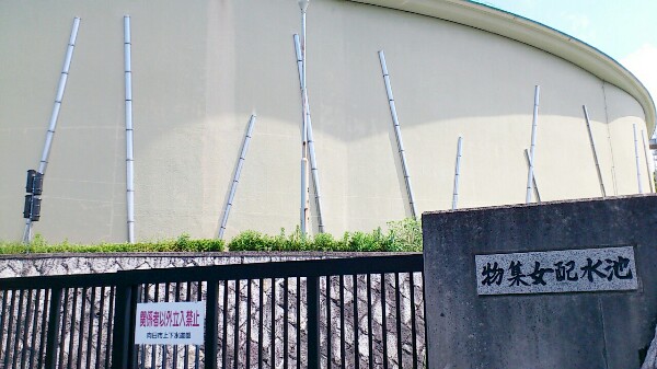 こちらはかぐや垣の正面にある物集女排水地。よく見るとタンクに竹の飾り付けがほどこされています。粋ですねぇ。