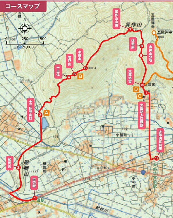 市辺駅~船岡山~十三仏登山口~十三仏~岩戸山~小脇山~箕作山山頂~休憩所~赤神山分岐~太郎坊宮~太郎坊入口階段~太郎坊宮前駅